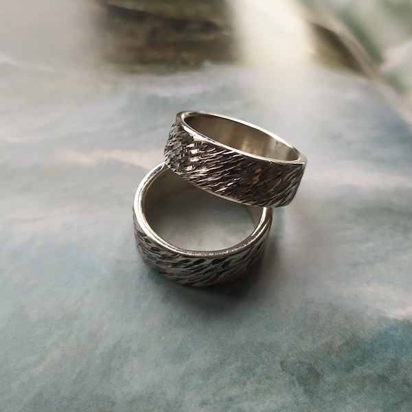 Anneau texturé avec un motif évoquant les clapotis sur l’océan. La texture est réalisée à la main, et donc varie un peu selon les modèles. Les photos ne sont donc pas contractuelles.