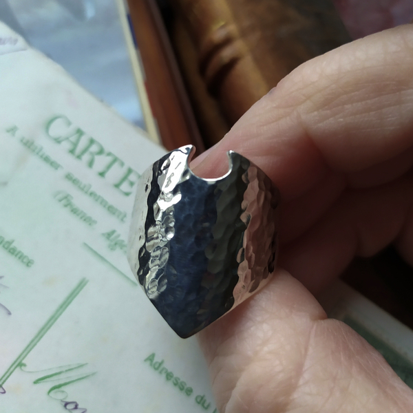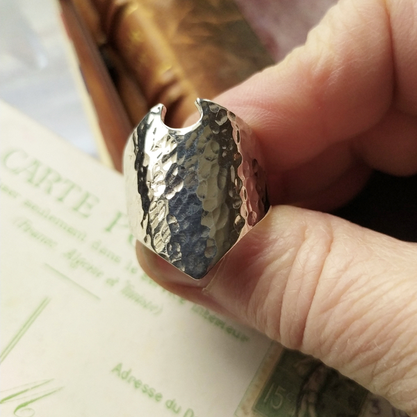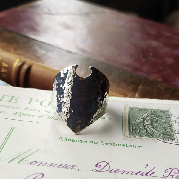 Bague évoquant un bouclier martelé.