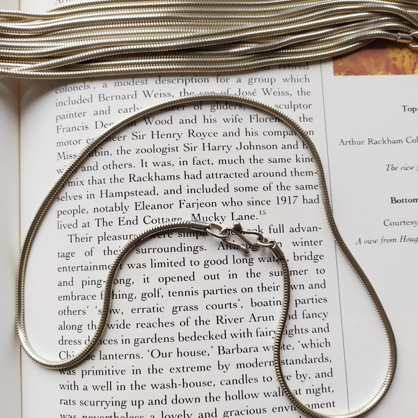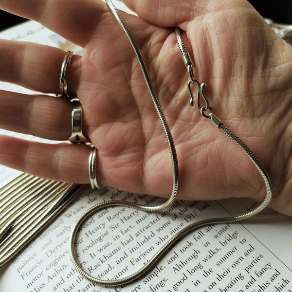 Comme toutes mes chaînes, elle est en argent sterling 925 (ou « premier titre »), sans traitement de surface (rhodiage*). Ainsi, elle garde sa couleur blanche chaude spécifique à l’argent et est donc parfaitement assorties aux pendentifs que je fabrique.