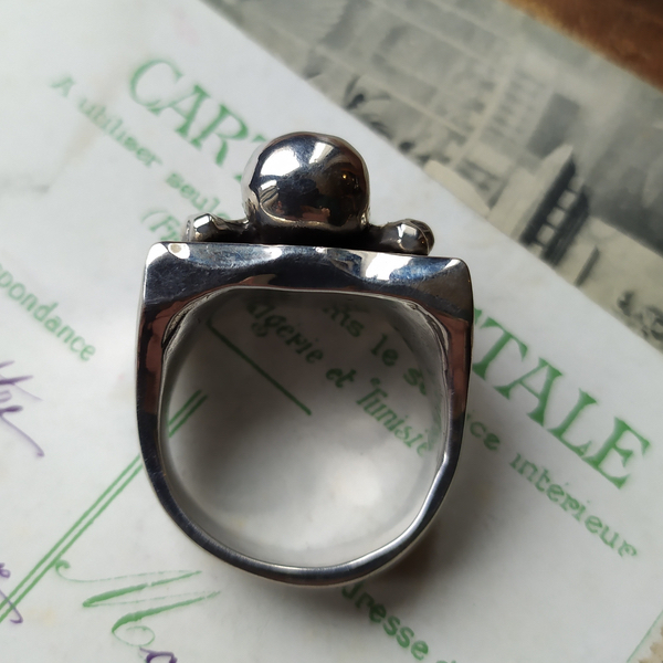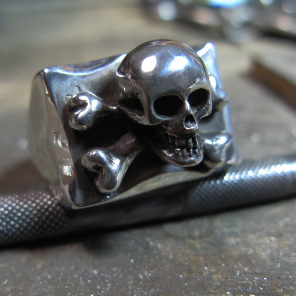 Grosse bague tête de mort, avec une tête de mort et os croisés.